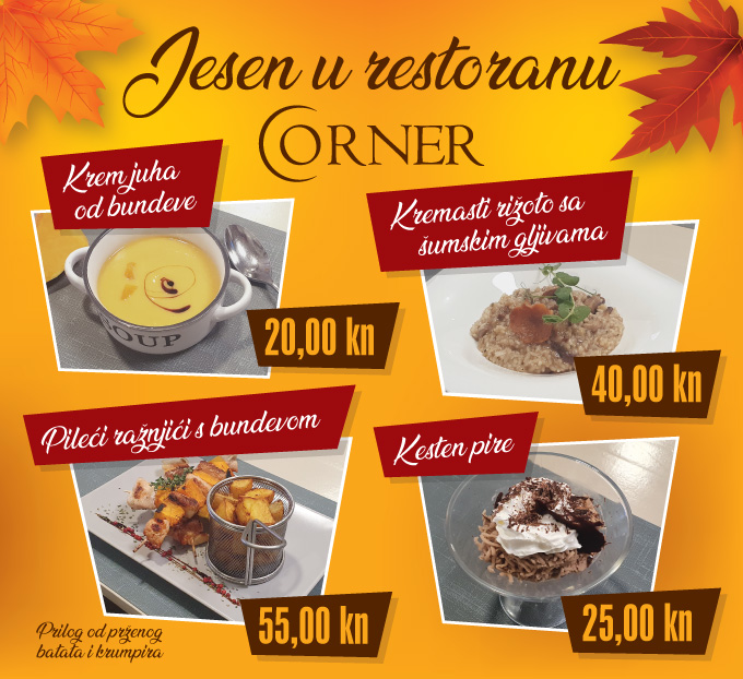 Jesen je u punom zamahu, a Corner vas poziva da kušate jesenske specijalitete po povoljnim cijenama. Za vas smo pripremili: Krem juha od bundeve - 20,00 kn Kremasti rižovo sa šumskim gljivama - 40,00 kn Pileći ražnjići  s bundevom, prilog [...]